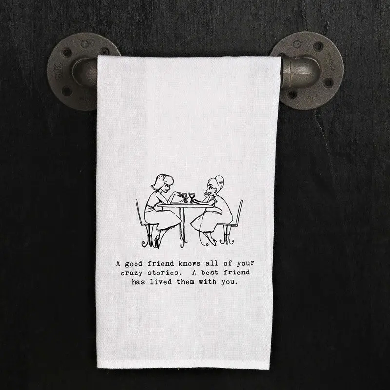 A good friend knows all of your crazy stories. A best friend has lived them with you. // Each 100% cotton towel is printed by hand, one at a time, and gets softer with each wash. Containing durable fabric and print, these absorbent towels will be the workhorse of your kitchen. Wrapped around a loaf of fresh banana bread, these towels are the perfect hostess gift for those who appreciate the beauty of handmade. COLD WASH/WARM DRY: Machine wash in cold water and warm dry. This will help to protect the life of the fabric and the shape of your towel. Product Dimensions: 20″x25″.