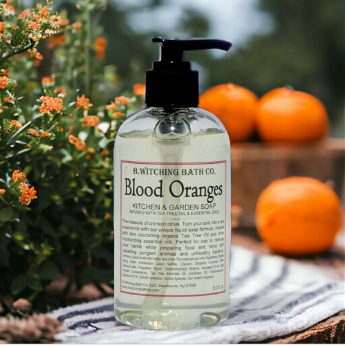 Garden Soap: Infused with real Blood Orange essential oil, embrace a Mediterranean treasure and bring this experience to your home. Perfect for dispelling pungent aromas from the garden or kitchen. Formulated with a touch of natural germ killing tea tree oil and designed for easy hand cleansing. Our liquid soaps leave your skin  gently scented with our luscious natural fragrance, tangerine, tart berries, sweet sugar syrup and green leaves.