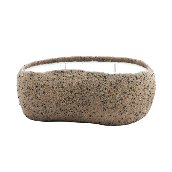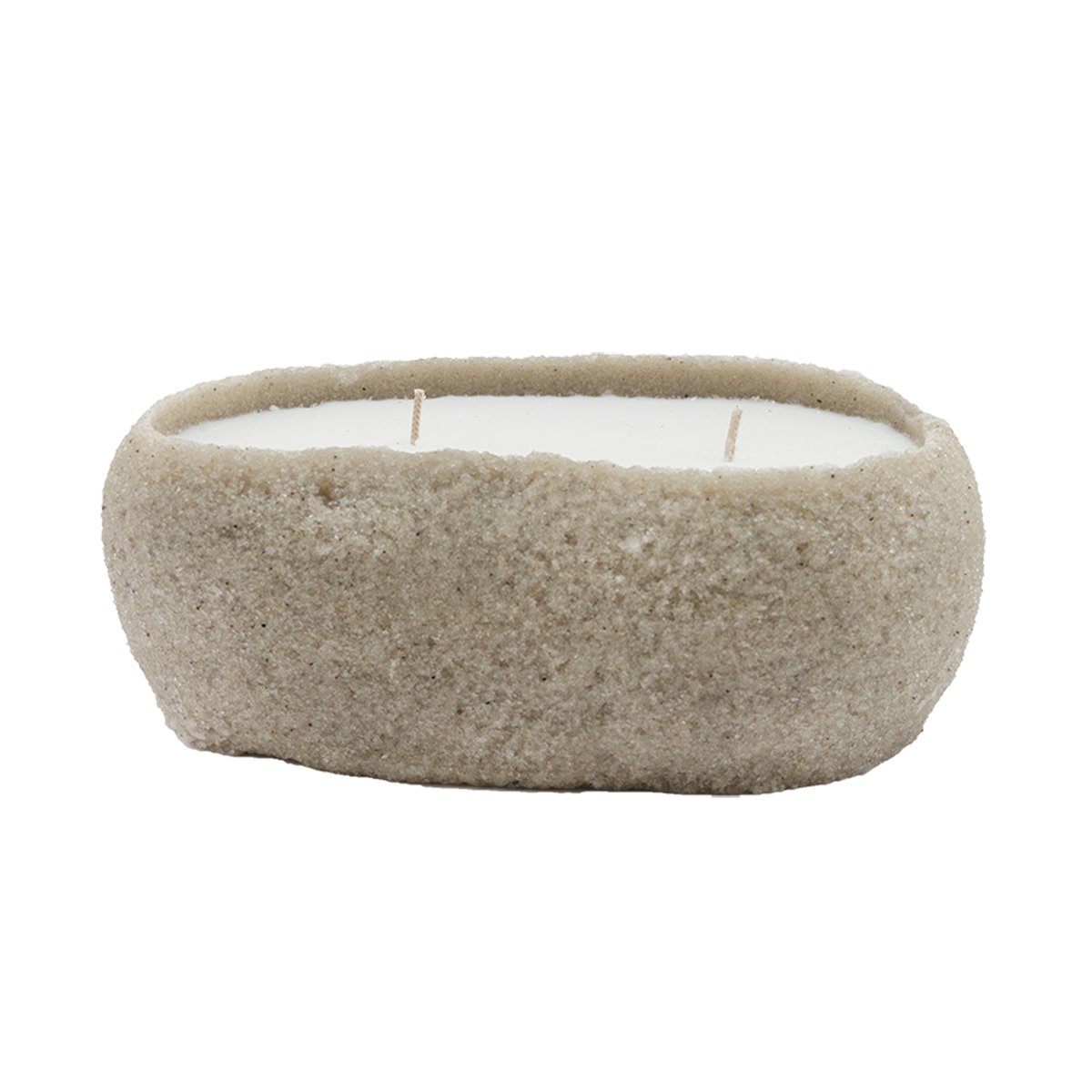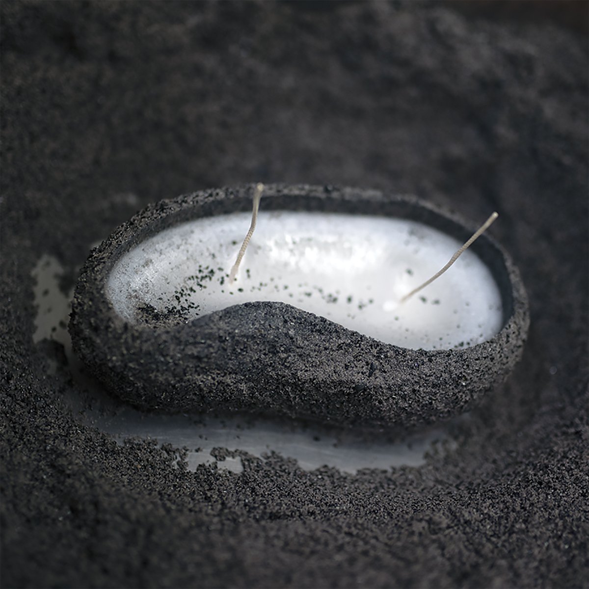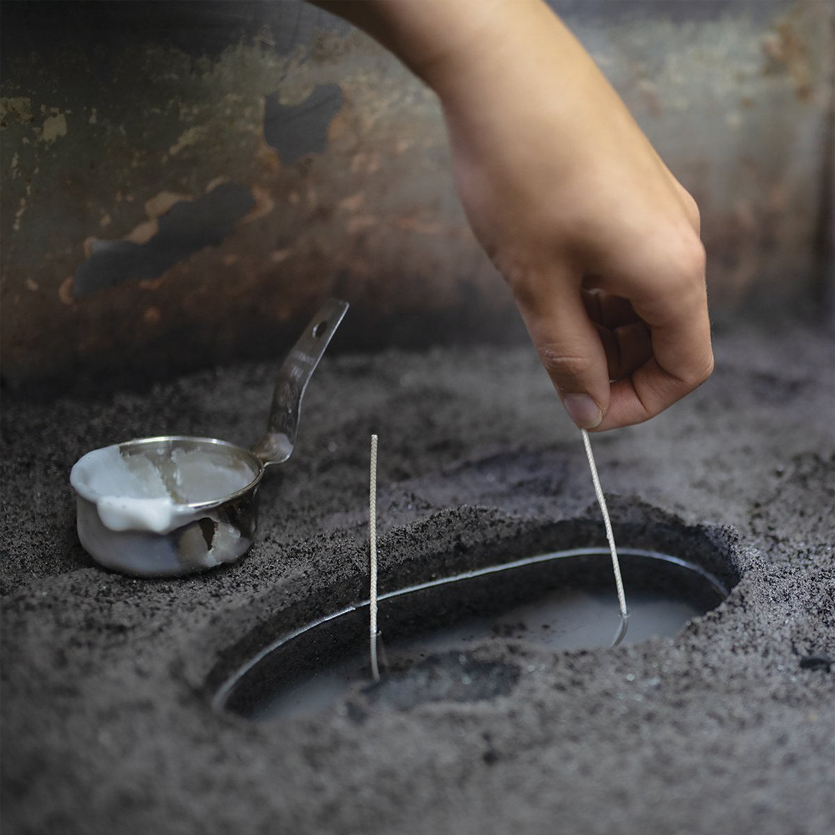 Sand is carved outEach by hand to create the vessel form. Then, hot wax is poured into the sculpted form to solidify the vessel shape. Once cooled, the excess sand is brushed away to reveal the candle and sealed to protect the textured exterior.