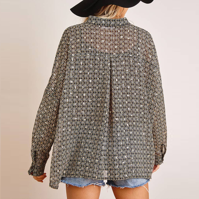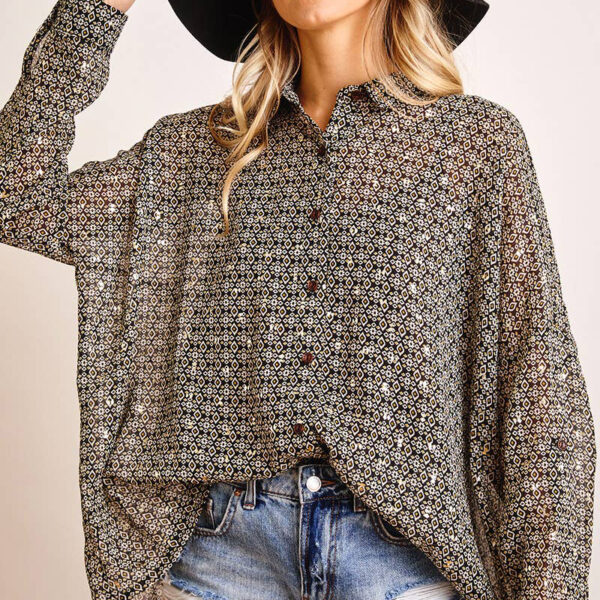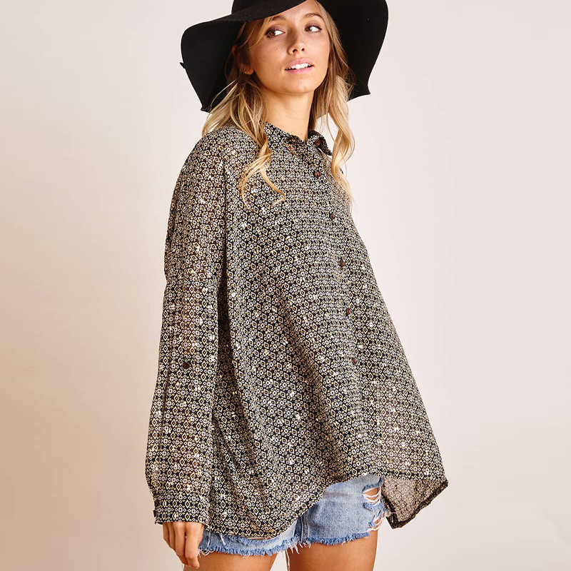 Printed chiffon fabric. Button up at front. Roll-up long sleeves. Collar. Sheer fabric. Relaxed fit.