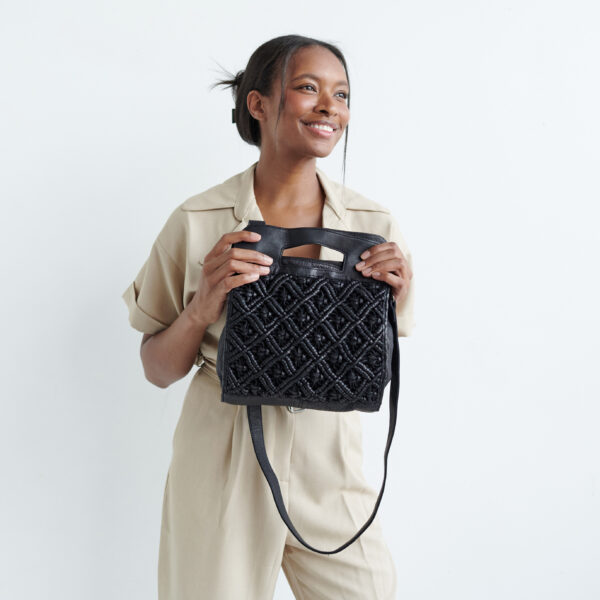 Dear former crossbody bag, giving you notice- our eyes are on Deja. Boho chic in an effortless, hand-crafted way. Medium size, softly woven leather macrame façade, top zippered entry, leather cut-out top handles + removable shoulder strap. Visions of doing twirls in a field of sunflowers…