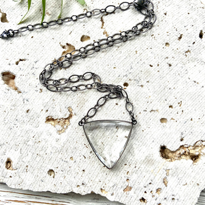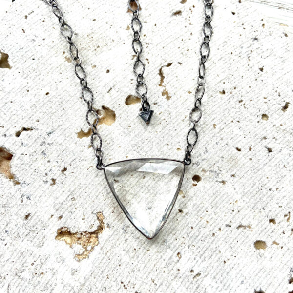This amazing edgy glam large triangle crystal quartz necklace is adjustable up to 20”. Stunning piece! The triangle pendants is 30”. Made in United States of America