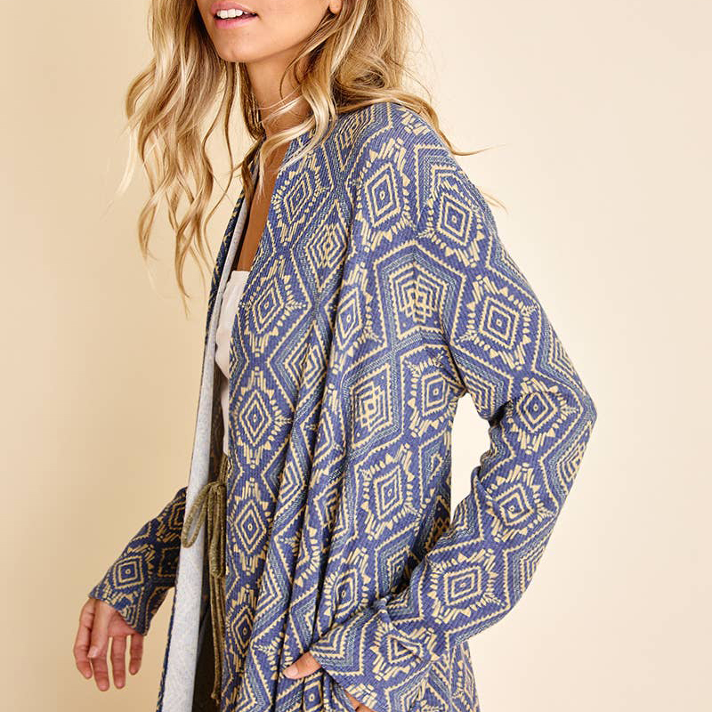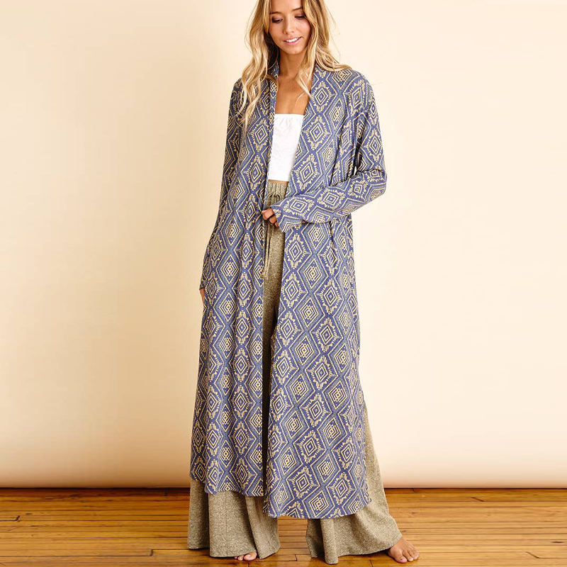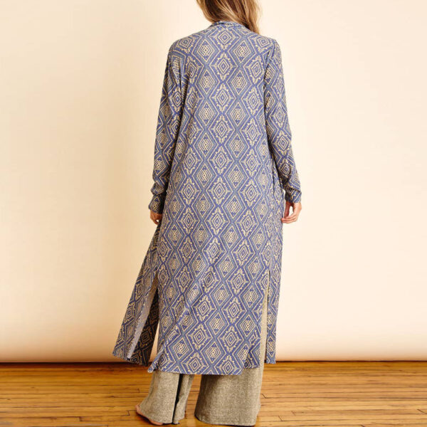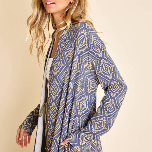 Easy to wear boho print cardigan with open front and side pockets with slits.