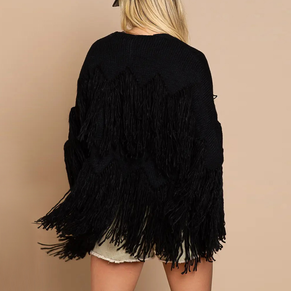 Boho styling and comfy, relaxed fit. Open front. Zig-zag tassel detailing throughout.