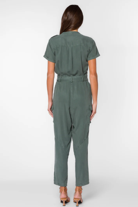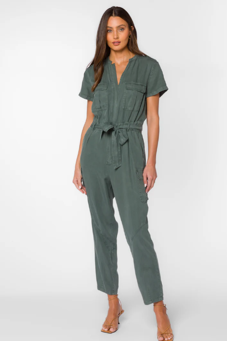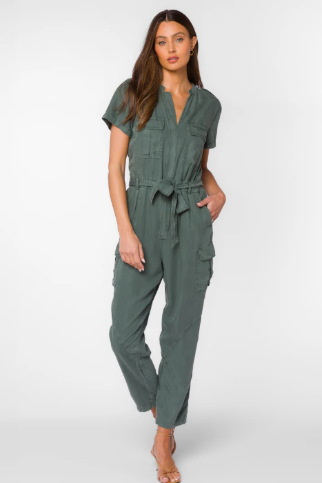 Casual, yet “dressed up”, this jumpsuit is soft and lightweight, with the relaxed fit of the utility style, and made from sustainable Tencel™. It has short cuffed sleeves, a V-neckline with mandarin collar, zip closure, self-belt tie, and flap chest pockets.