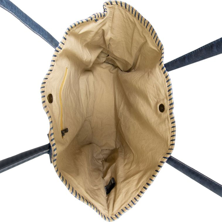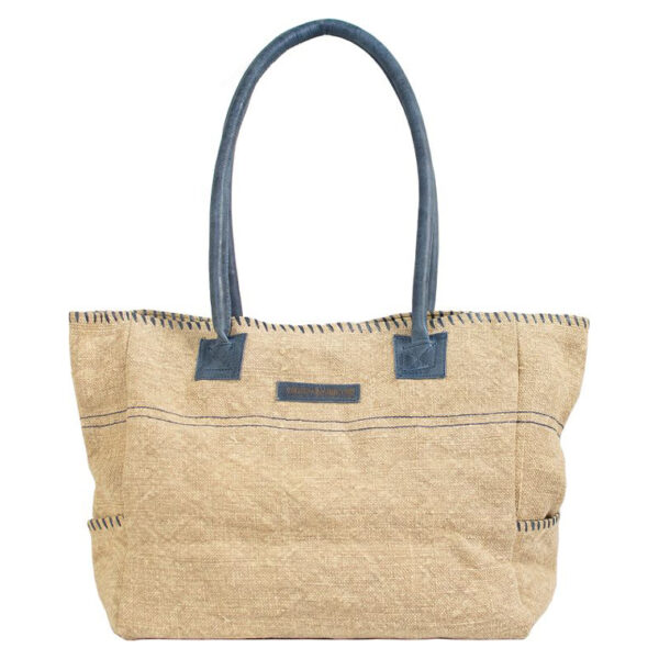 This handcrafted with recycled Jute is adorned with saddle stitch trim. Double leather handles and 1 interior zip pocket. Fully lined.