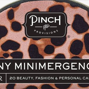 Spotted: the Leopard Skinny Minimergency Kit by Pinch Provisions in a fresh demi-lune silhouette. Slim enough to fit into any cross-body or clutch, but packed with 20 emergency essentials. contains: facial tissue, emery board, tweezers, breath freshener, lip balm, clear elastics, tampon, hairspray, mirror, stain remover, nail polish remover, bobby pins, mirror, blotting tissue, double sided tape, safety pin, earring back, clear elastics, needle and thread, dental floss, and an adhesive bandage.