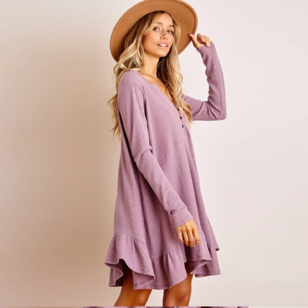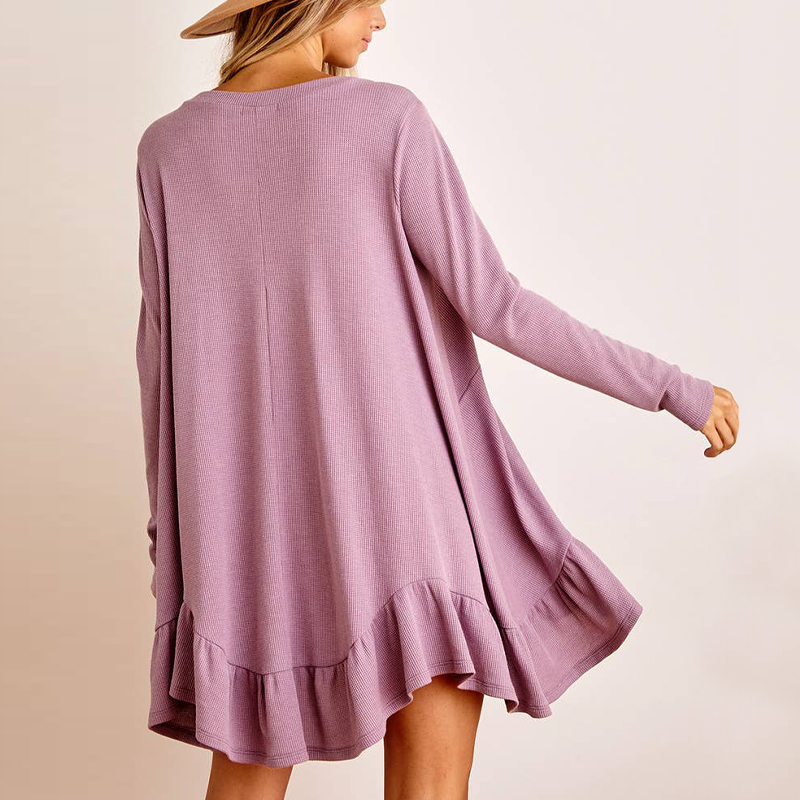 Long Sleeve. Ruffle Hem. Flowy Tunic. Top Button closure. V-neck.