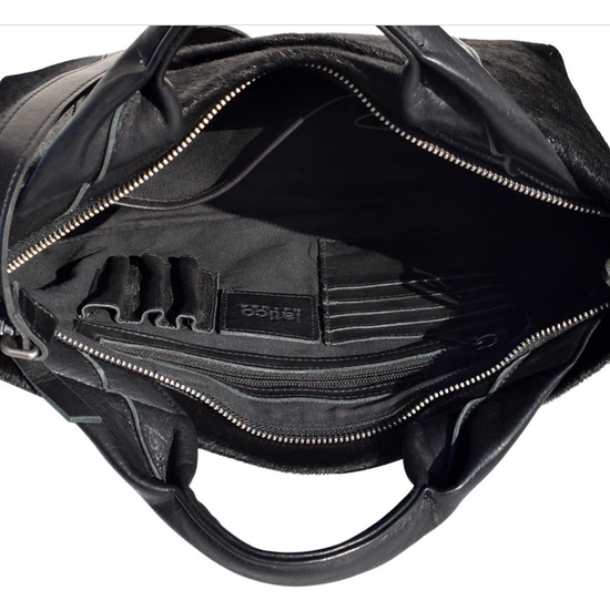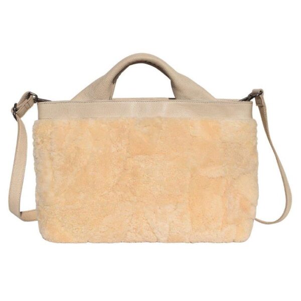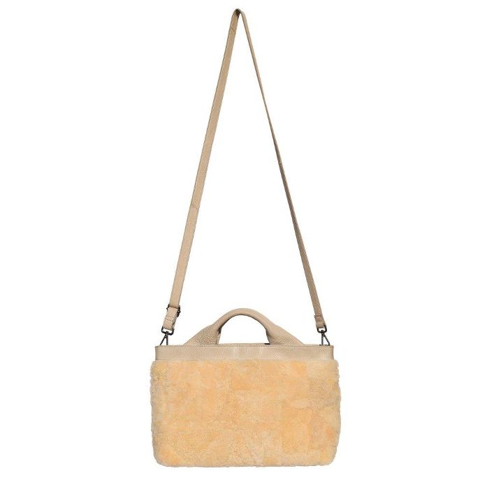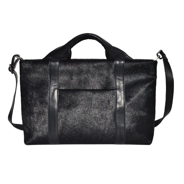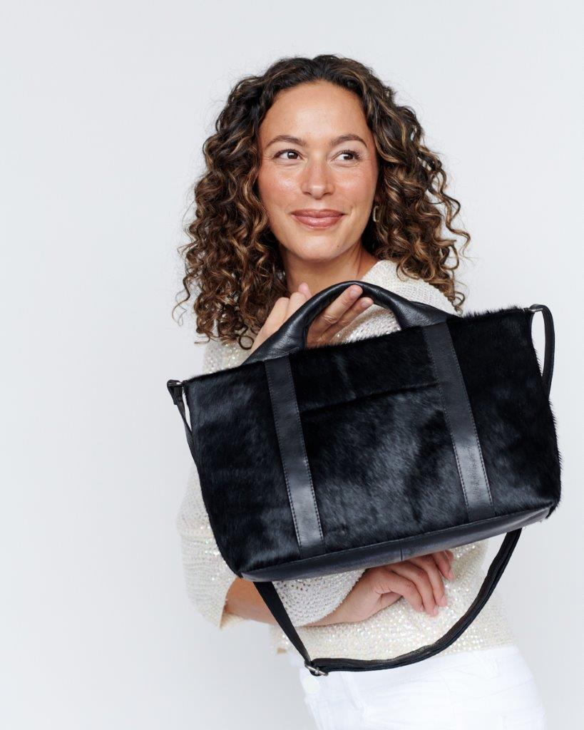 Up-cycled beige shearling patchwork collected from garment waste and meticulously stitched together, authentic black cow hair. Can be worn hands-free with crossbody strap or hand-held.