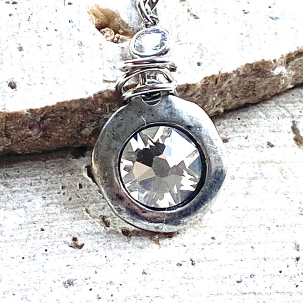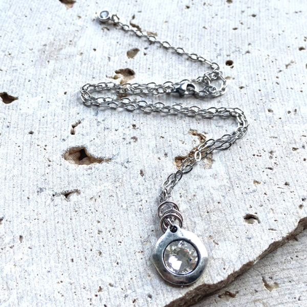 Our beat selling hand casted necklace with a genuine Swarovski crystal is now available in antique silver!! Stainless steel non tarnishing chain adjustable up to 19” Made in United States of America
