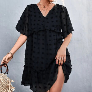 This Swiss dot dress is going to be very persuasive on any occasion. It’s so precious and sweet with all of that feminine detailing. The ruffled detailing along the tank straps is so cute and that light Swiss dot fabric is super trendy. This dress features a v-neck, ruffled detailing and Swiss dot fabric.