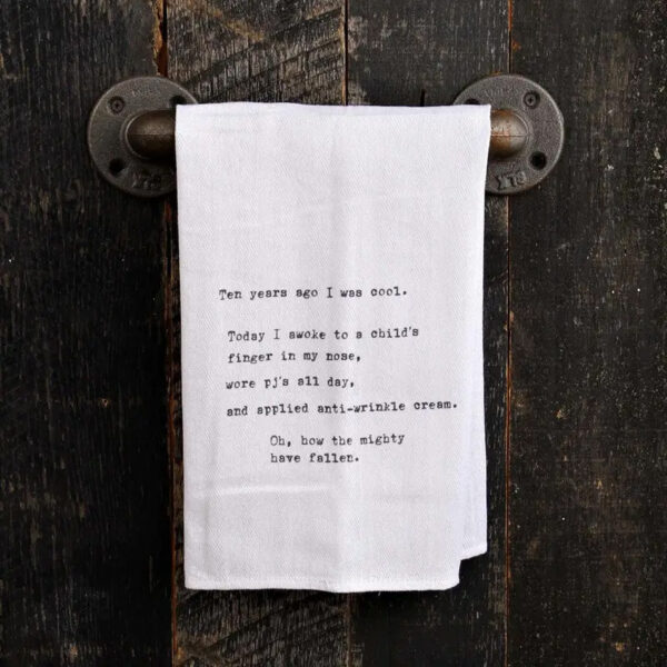 Ten years ago I was cool. Today I woke to a child’s finger in my nose, wore pj’s all day, and applied anti-wrinkle cream. Oh, boy, the mighty have fallen hand towel